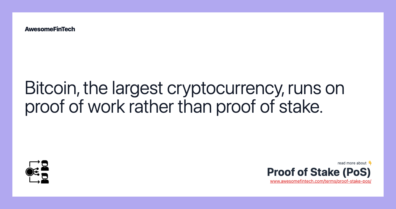 Bitcoin, the largest cryptocurrency, runs on proof of work rather than proof of stake.