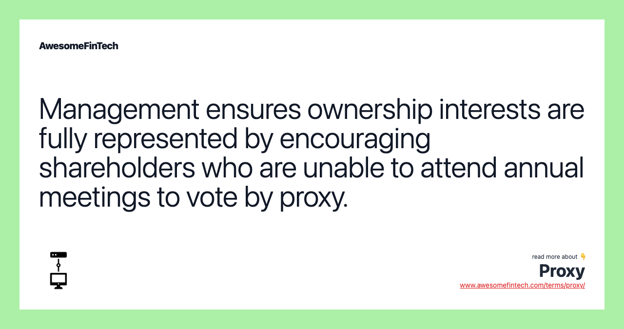A proxy is an agent legally authorized to act on behalf of another party or a format that allows an investor to vote without being physically present at the meeting. The proxy discloses important information on agenda items for the annual meeting, lists the qualifications of management and board members, serves as a ballot for elections to the board of directors, lists the largest shareholders of a company's stock, and provides detailed information about executive compensation. A Proxy Statement is a packet of documents containing information necessary to make informed votes on issues facing the company. While proxy voting is often an option, management encourages shareholders to vote in person. Shareholders not attending a company's annual general meeting (AGM) may vote their shares by proxy by allowing someone else to cast votes on their behalf, or they Management ensures ownership interests are fully represented by encouraging shareholders who are unable to attend annual meetings to vote by proxy.