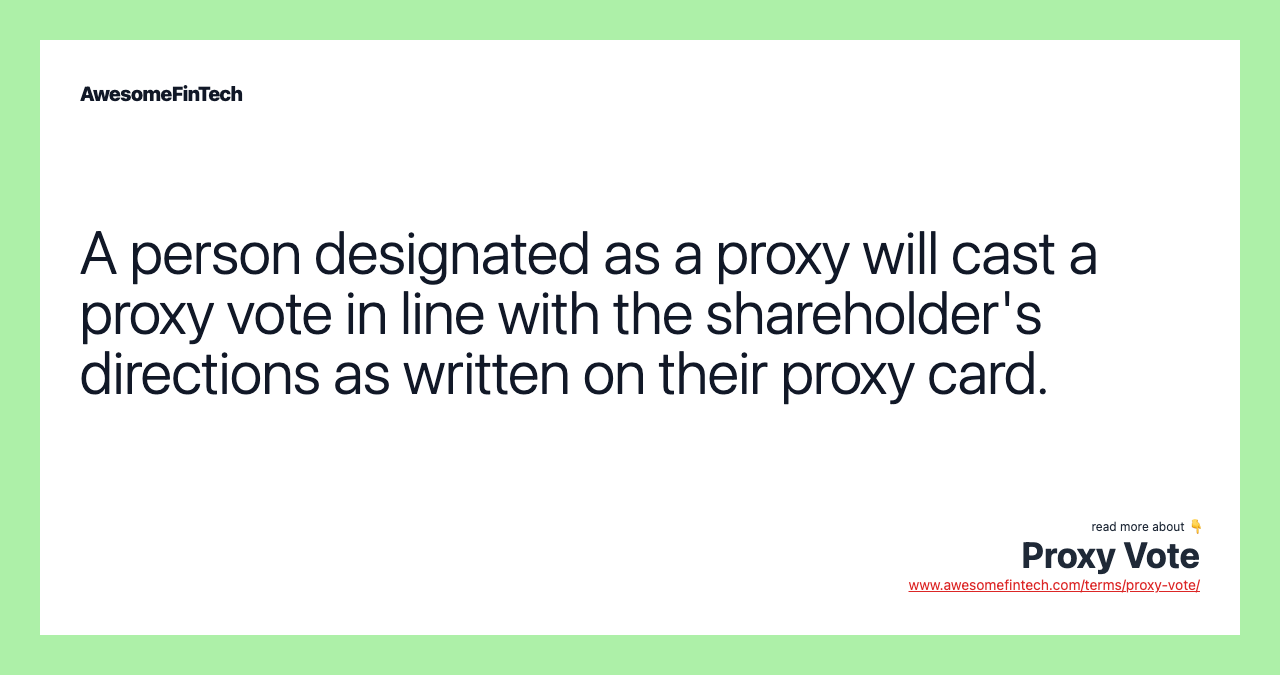 Rather than physically attending the shareholder meeting, investors may elect someone else, such as a member of the company's management team, to vote in their place. This person is designated as a proxy and will cast a proxy vote in line with the shareholder's directions as written on their proxy card. Proxy votes may be cast by mail, phone, or online before the cutoff time. This is typically 24 hours before the shareholder meeting. Responses may include "For," "Against," "Abstain," or "Not Voted."