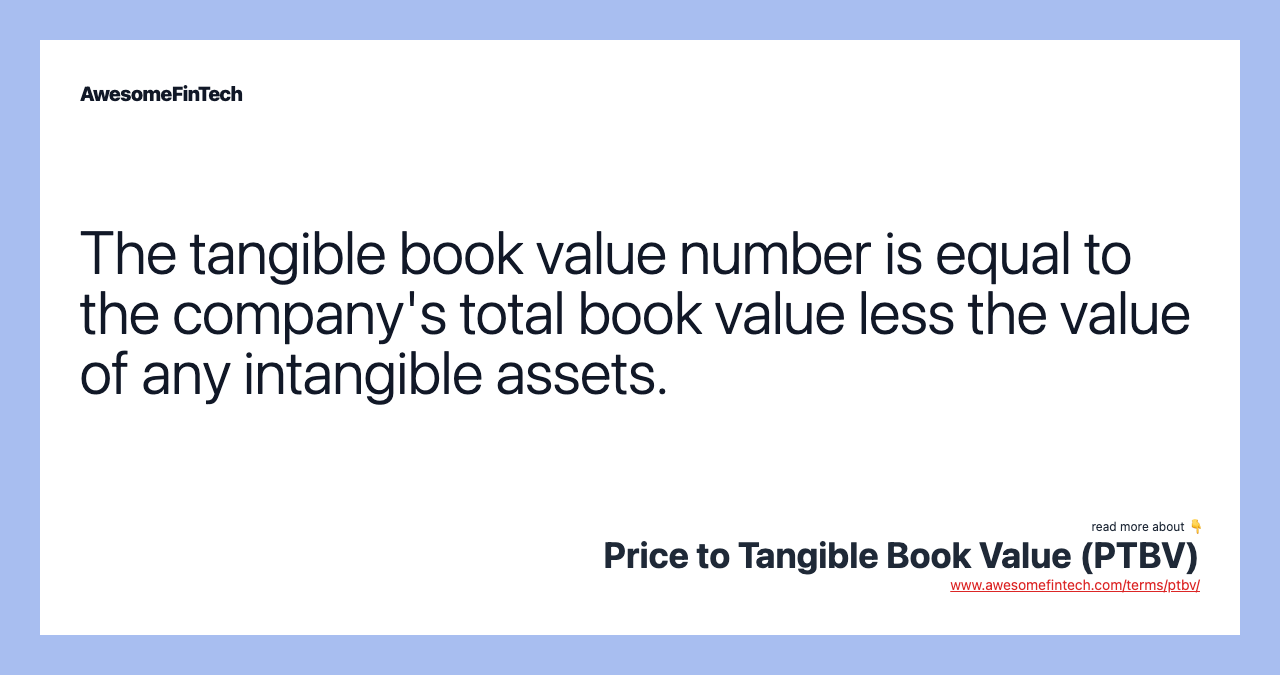 Price to tangible book value (PTBV) is a valuation ratio expressing the price of a security compared to its hard or tangible assets' book value as reported in the company's balance sheet. The tangible book value number is equal to the company's total book value less the value of any intangible assets, such as patents, intellectual property, goodwill, etc.