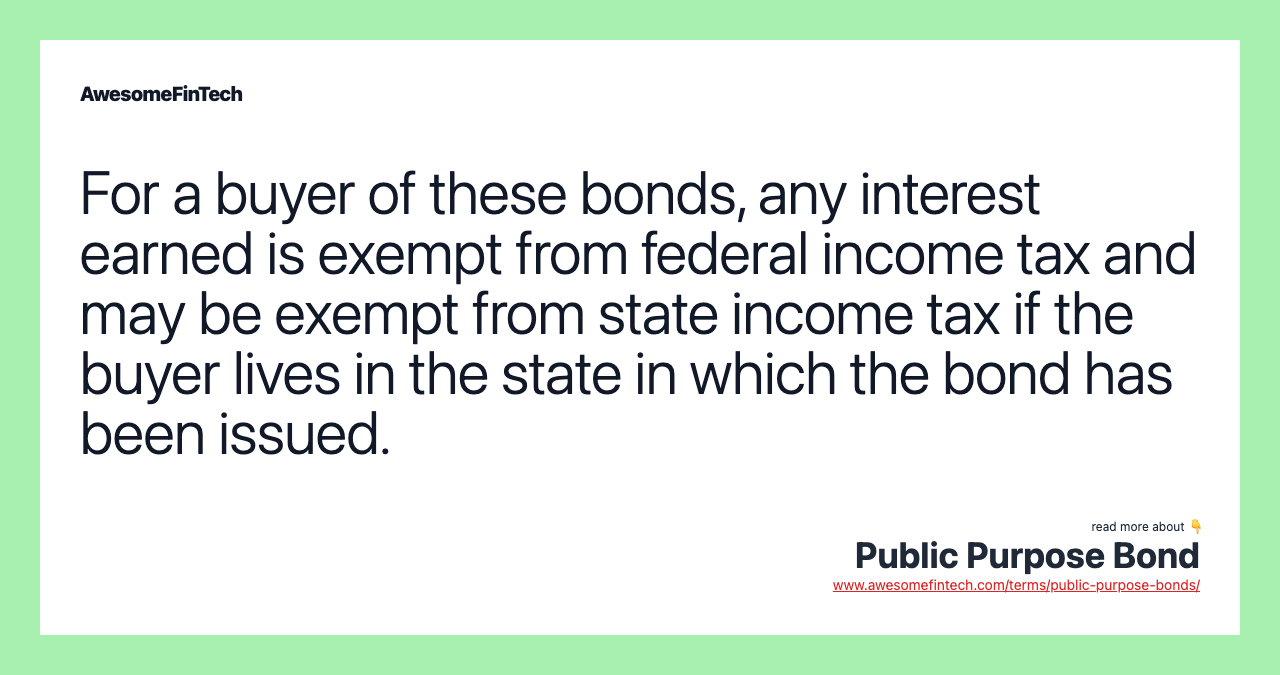 Public purpose bonds enjoy mostly tax-exempt status. Their income is tax-free at the federal level, and often at the state level if the individual resides in the state of bond issuance.