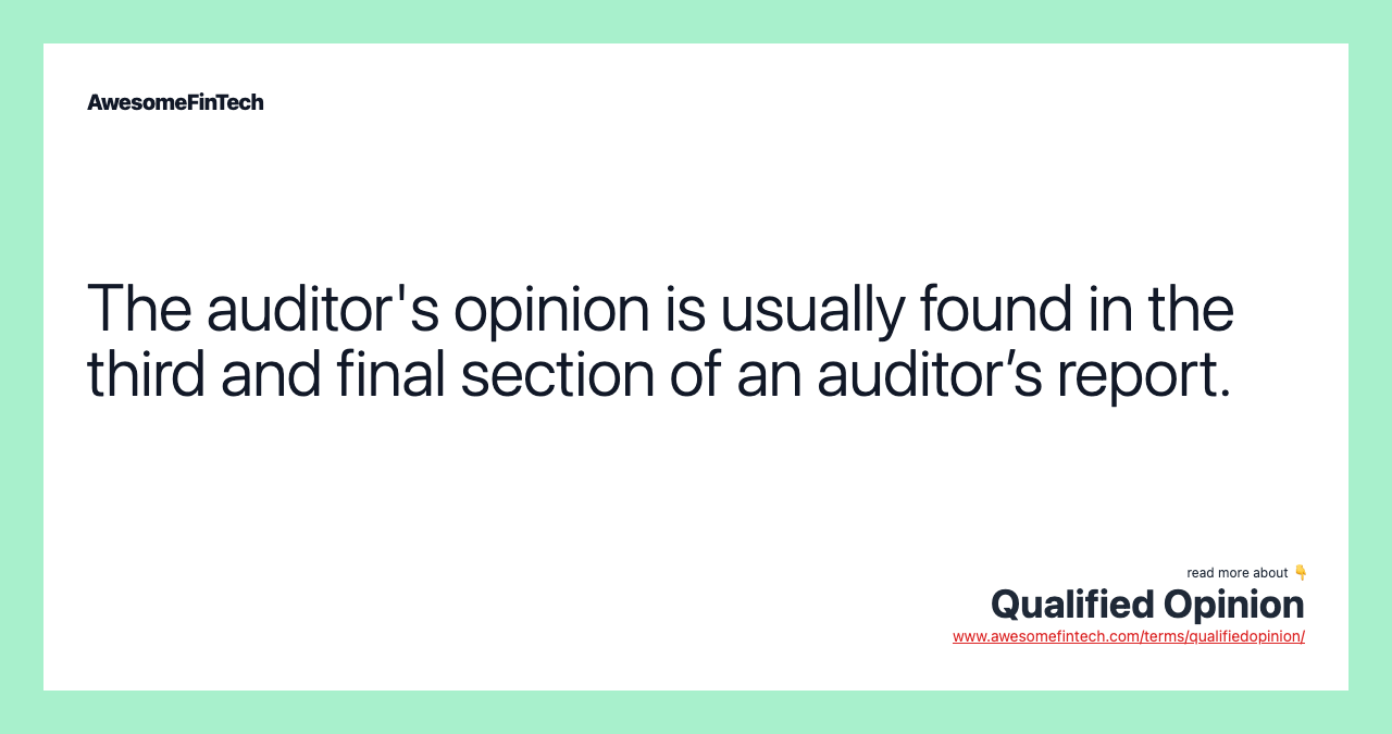 A qualified opinion is listed in the third and final section of an auditor’s report. The first section of the report outlines management’s responsibilities in regards to preparing the financial statements and maintaining internal controls. The second section outlines the auditor’s responsibilities. In the third section, an opinion is given by the independent auditor regarding the company’s internal controls and accounting records. The opinion may be unqualified, qualified, adverse, or a disclaimer of opinion.