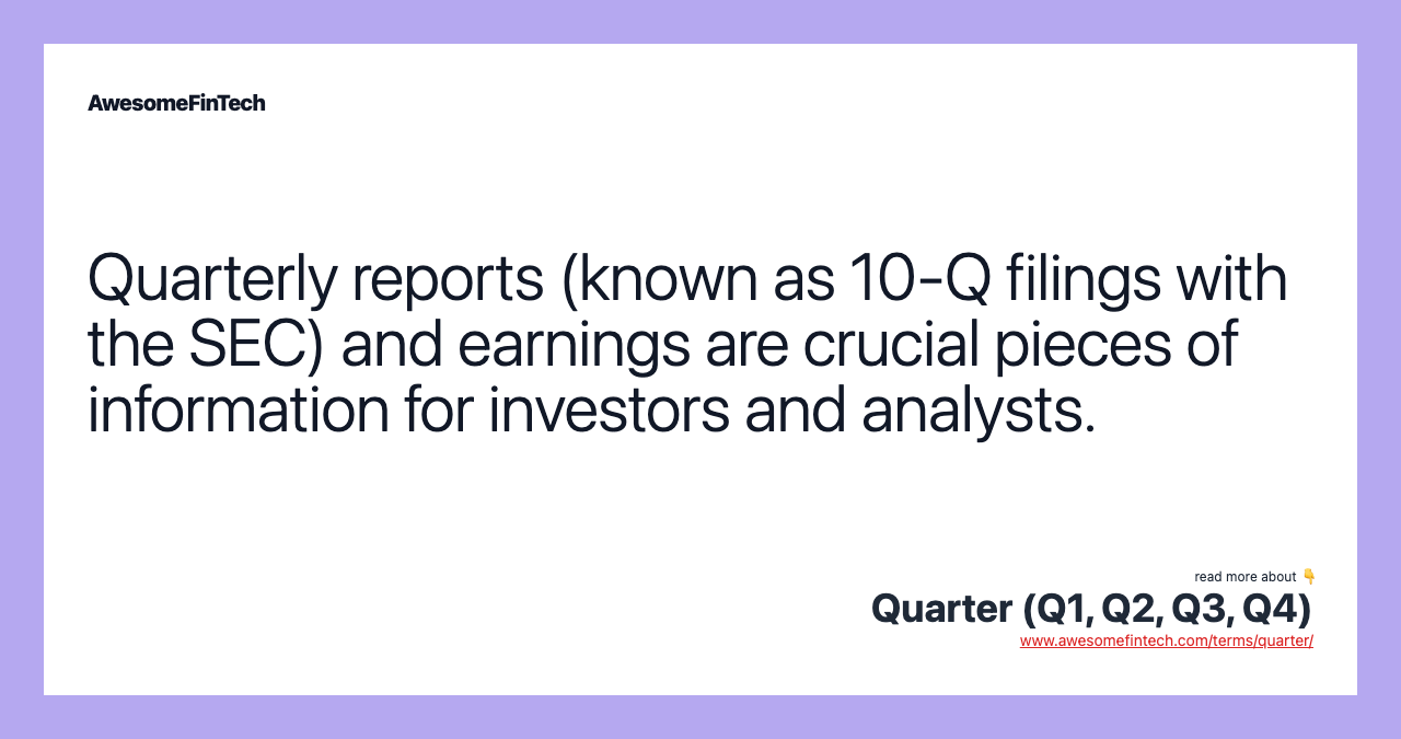 A quarter is a three-month period on a company's financial calendar that acts as a basis for periodic financial reports and the paying of dividends. A quarter refers to one-fourth of a year and is typically expressed as Q1 for the first quarter, Q2 for the second quarter, and so forth. For example, a quarter is often shown with its relevant year, as in Q1 2021 or Q121, which represents the first quarter of the year 2021.