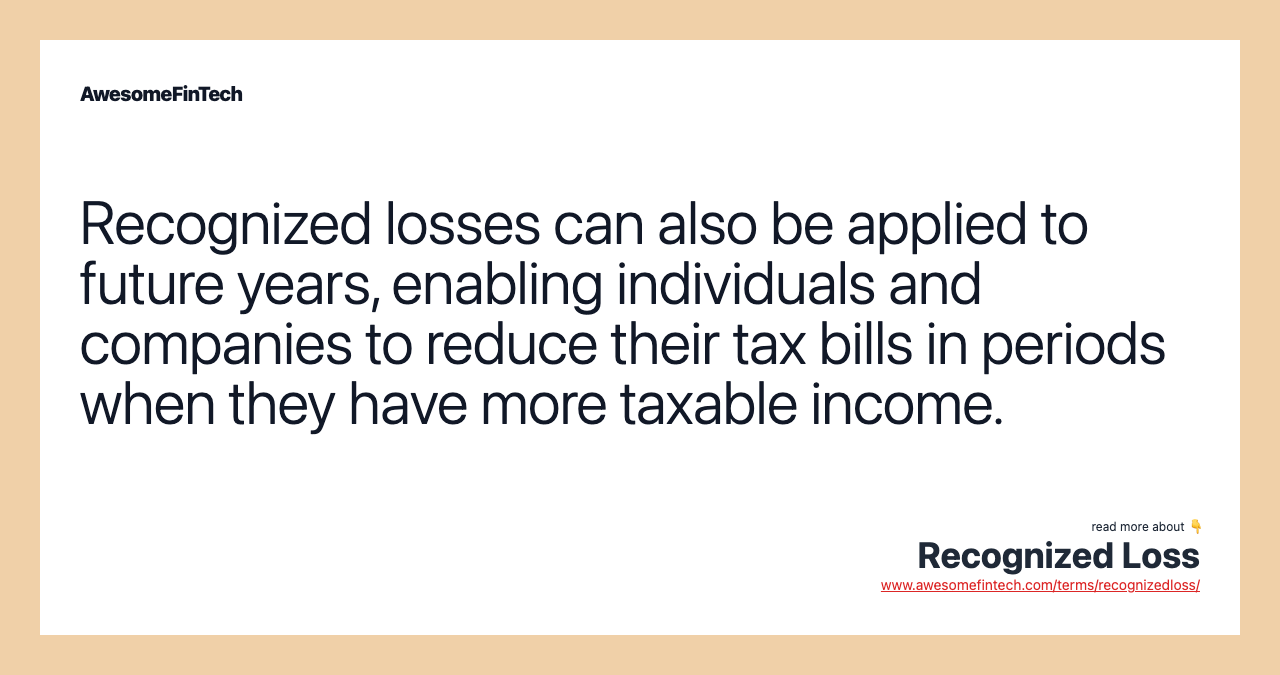 Recognized losses can also be applied for up to a certain number of years. That means that if a company or individual has no taxable income in a given year, recognized losses may offset taxes on profits at a future date instead.