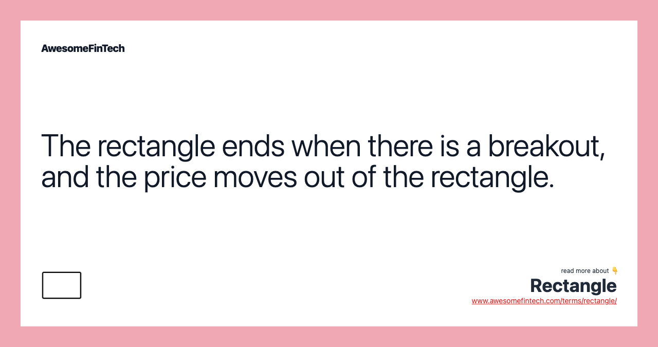 A rectangle is a pattern that occurs on price charts. In a rectangle pattern, investors will see the price of the security test the levels of support and resistance several times before a breakout. Some traders like to take the rectangle's height and then add it to the rectangle's top for an upside breakout (or subtract the height from the bottom of the rectangle on a downside breakout). The term refers to an instance in which the price of a security is trading within a bounded range where the levels of resistance and support are parallel to each other, resembling the shape of a rectangle. The price moves sideways, topping out and bottoming at a similar price on each price swing.