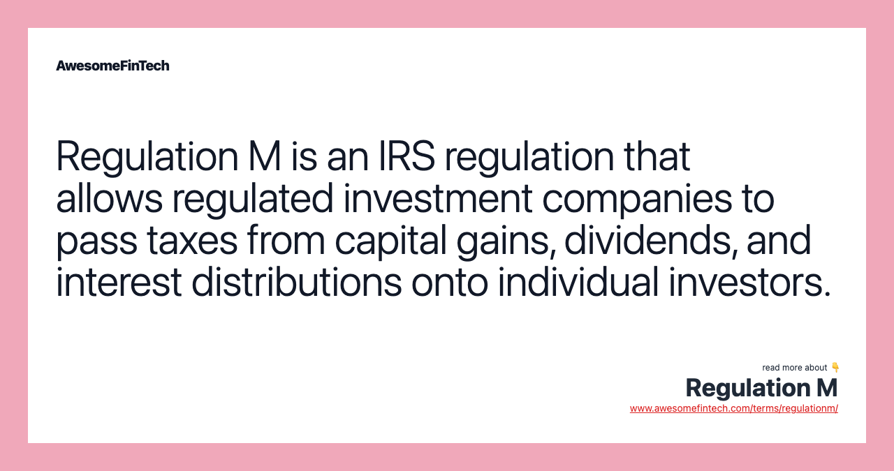 Regulation M, also known as Subchapter M, is an Internal Revenue Service (IRS) regulation that allows regulated investment companies to pass taxes from capital gains, dividends, and interest distributions onto individual investors. Regulation M conforms to the conduit theory, which states that investment firms should pass capital gains, interest, and dividends to shareholders in order to avoid double taxation by the company and the individual investors.