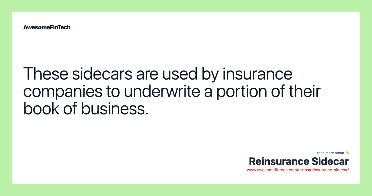 Insurance companies usually set up reinsurance sidecar structures to underwrite some portion of their book of business. Typically, existing reinsurers will create sidecars as they try to spread the risk among third-party investors such as hedge funds and equity firms.