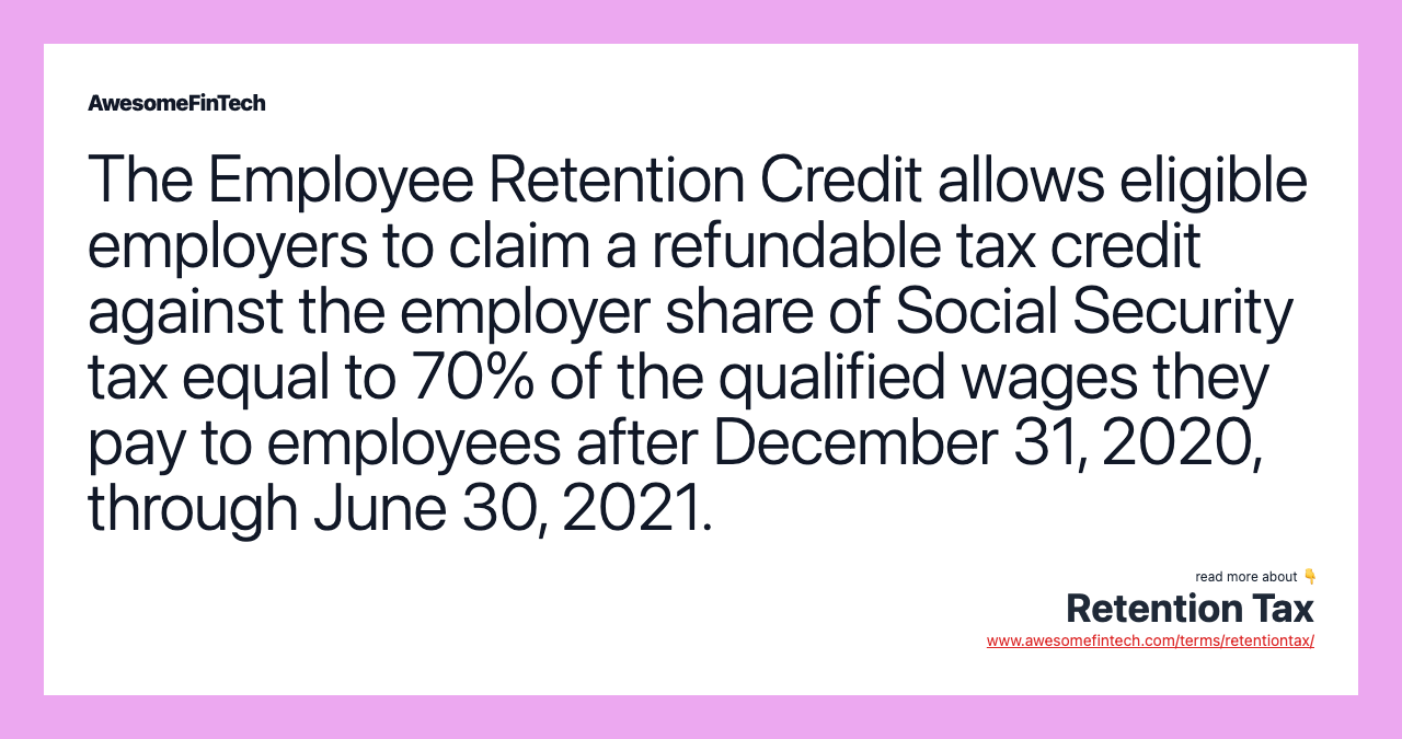 A retention tax is a tax withheld at the source, that is, by the employer. The Employee Retention Credit allows eligible employers to claim a refundable tax credit against the employer share of Social Security tax equal to 70% of the qualified wages they pay to employees after December 31, 2020, through June 30, 2021. The new version of the credit allows eligible employers to claim a refundable tax credit against the employer share of Social Security tax equal to 70% of the qualified wages they pay to employees after December 31, 2020, through June 30, 2021. Whatever the reason for a tax withholding, the amount retained is an estimate of those taxes that the employee will owe at the end of the tax year. Taxpayers who have reason to expect zero tax liability at the end of the tax year can claim exemption from withholding.