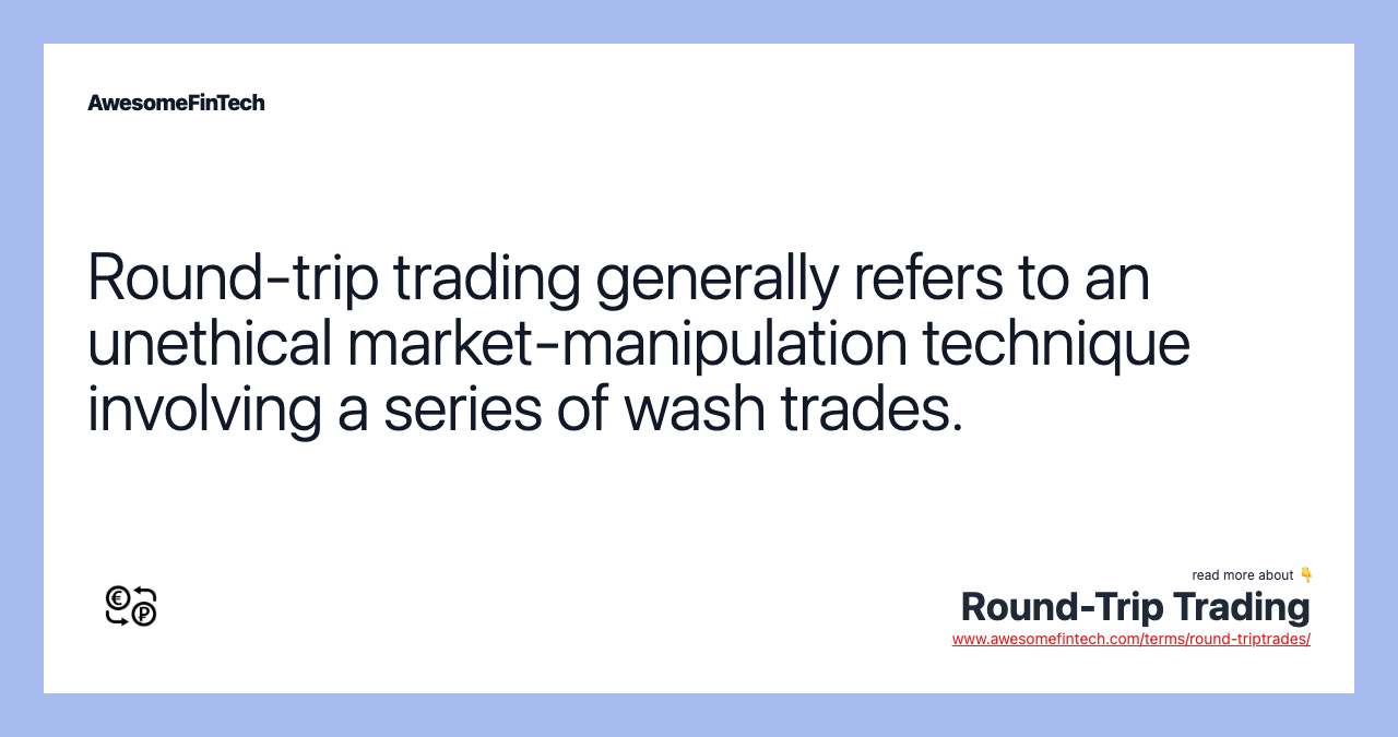 Round-trip trading, or "round-tripping," usually refers to the unethical practice of purchasing and selling shares of the same security over and over again in an attempt to manipulate observers into believing that the security is in higher demand than it actually is. By creating fake trading volume, round-tripping can also interfere with technical analysis based on volume data.