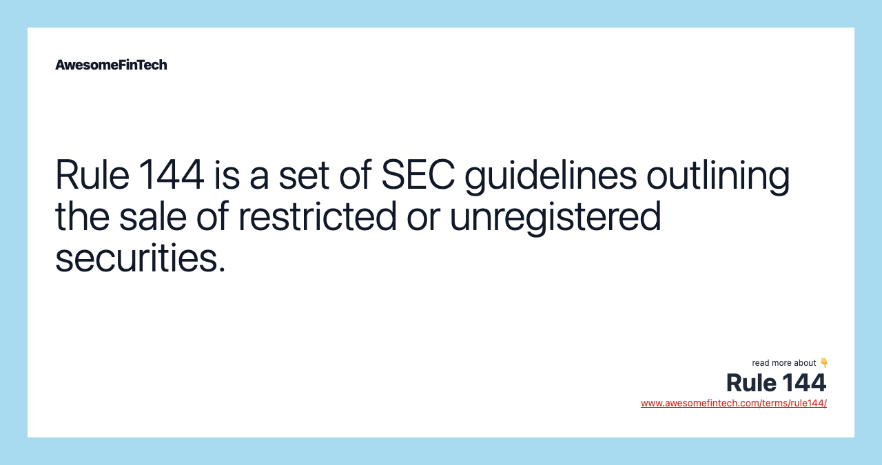 Rule 144 is a regulation enforced by the U.S. Securities and Exchange Commission (SEC) that sets the conditions under which restricted, unregistered, and control securities can be sold or resold. Rule 144 provides an exemption from registration requirements to sell the securities through public markets if a number of specific conditions are met. The regulation applies to all types of sellers, in addition to issuers of securities, underwriters, and dealers.