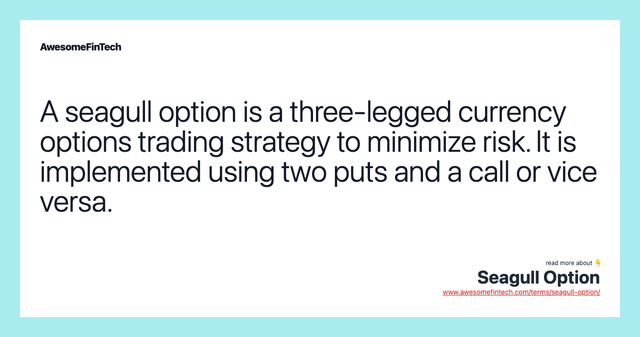 A seagull option is a three-legged option trading strategy that involves either two call options and a put option or two puts and a call. A seagull option is a three-legged option trading strategy that involves either two call options and a put option or two puts and a call. While the seagull strategy typically involves bull call spreads and bear put spreads, they can also involve the opposite using bear call spreads and bull put spreads. In the second example above, a hedger uses a seagull option structured as the purchase of a call spread (two calls), financed by the sale of one out of the money put, ideally to create a zero premium structure. A bullish seagull strategy involves a bull call spread (debit call spread) and the sale of an out of the money put.