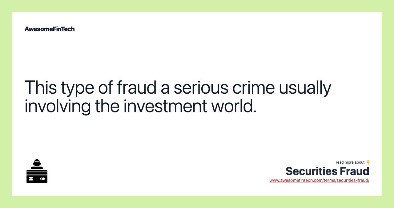 Securities fraud, also referred to as stock or investment fraud, is a type of serious white-collar crime that can be committed in a variety of forms but primarily involves misrepresenting information investors use to make decisions. The Federal Bureau of Investigation (FBI) describes securities fraud as criminal activity that can include high yield investment fraud, Ponzi schemes, pyramid schemes, advanced fee schemes, foreign currency fraud, broker embezzlement, hedge fund related fraud, and late-day trading. In many cases, the fraudster seeks to dupe investors through misrepresentation and to manipulate financial markets in some way. Securities fraud, also referred to as stock or investment fraud, is a type of serious white-collar crime that can be committed in a variety of forms but primarily involves misrepresenting information investors use to make decisions. Securities fraud can also include false information, pump-and-dump schemes, or trading on insider information. The FBI warns that security fraud is often noted by unsolicited offers and high-pressure sales tactics on the part of the fraudster, along with demands for personal information such as credit card information and Social Security numbers. The Securities and Exchange Commission (SEC), the FBI, and other federal and state agencies