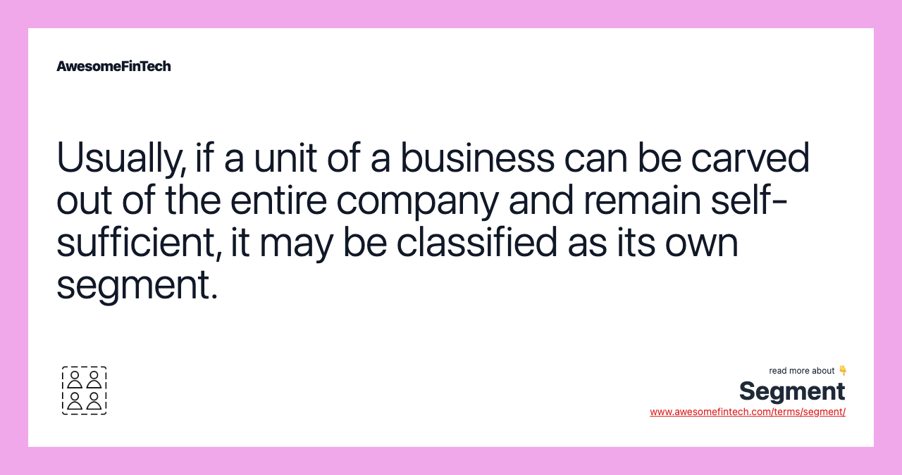 Table of Contents What Is a Segment? Understanding Segments Benefits of Segments Example of a Segment A business segment is a portion of a business that generates revenue from selling a product or a line of products, or by providing a service that is separate from the primary line of focus for the business. A company may segment its business by region in the same way that Apple has one silo for North and South America, another for Europe (which includes all European countries, the Middle East, and Africa), and another separate segment just for Japan. The market segmentation process includes placing potential buyers into segments, segmenting products into categories, identifying which products should be marketed to the segments and what those market sizes are, choosing which markets to target, and marketing to those target markets. Usually, if a unit of a business can be separated or lifted out of the company as a whole and remain self-sufficient, it satisfies the criteria of being classified as a business segment.