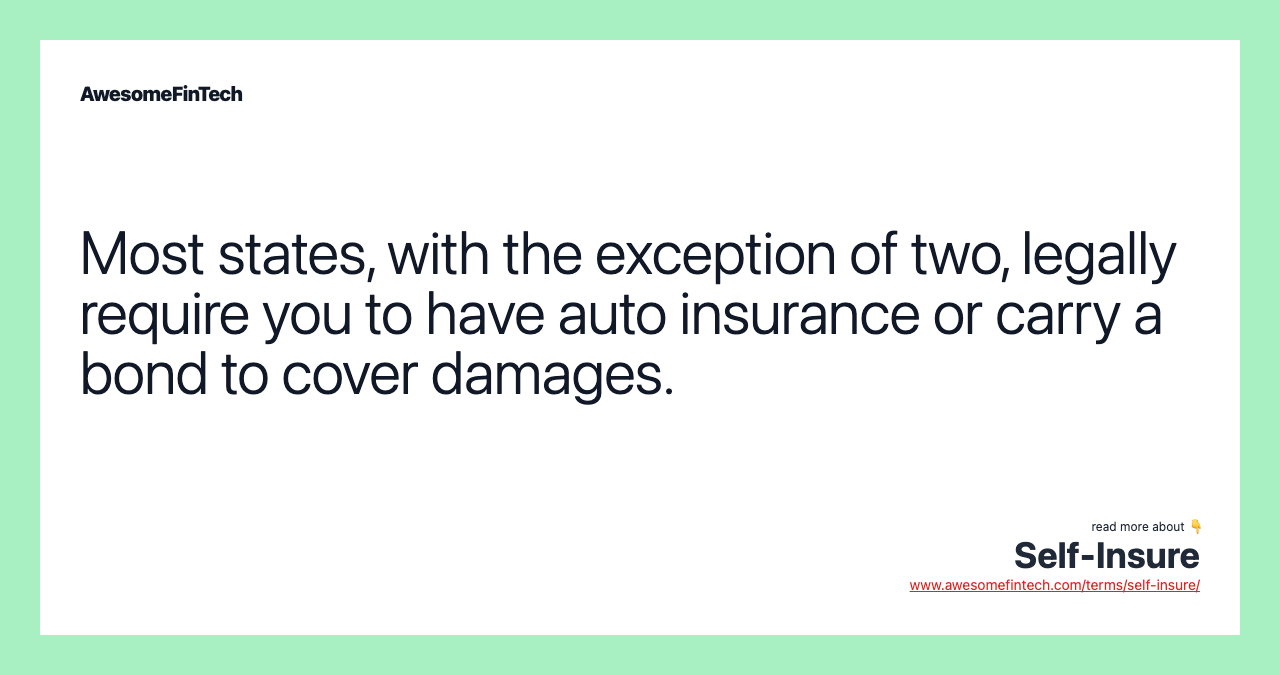 It is possible to carry a bond instead of auto insurance in some states, but you are still financially responsible if you are in an accident, mainly if you are found at-fault. Paying for insurance is a safety net for you, your possessions, and your family. If you choose to self-insure, you may save money over the years. The downside? You must be willing to commit to saving a lot of money to protect yourself from emergencies — such as fire, floods, accidents, and even death.