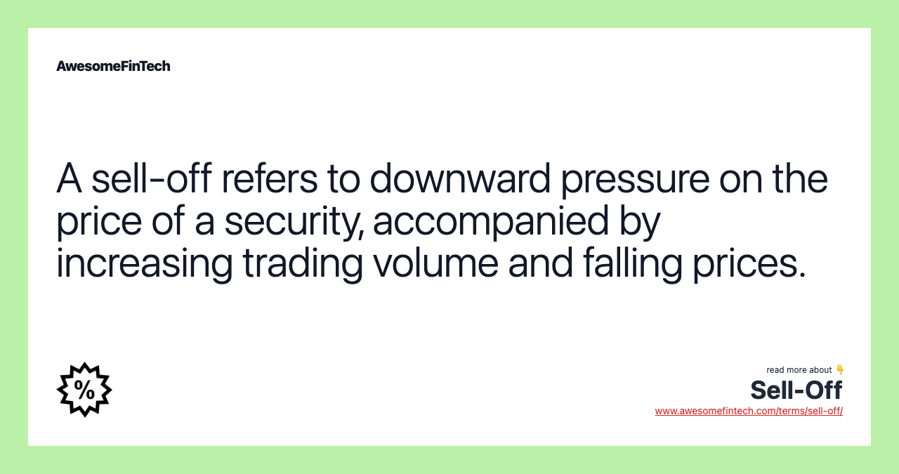 A sell-off occurs when a large volume of securities are sold in a short period of time, causing the price of a security to fall in rapid succession. As more shares are offered than buyers are willing to accept, the decline in price may accelerate as market psychology turns pessimistic.