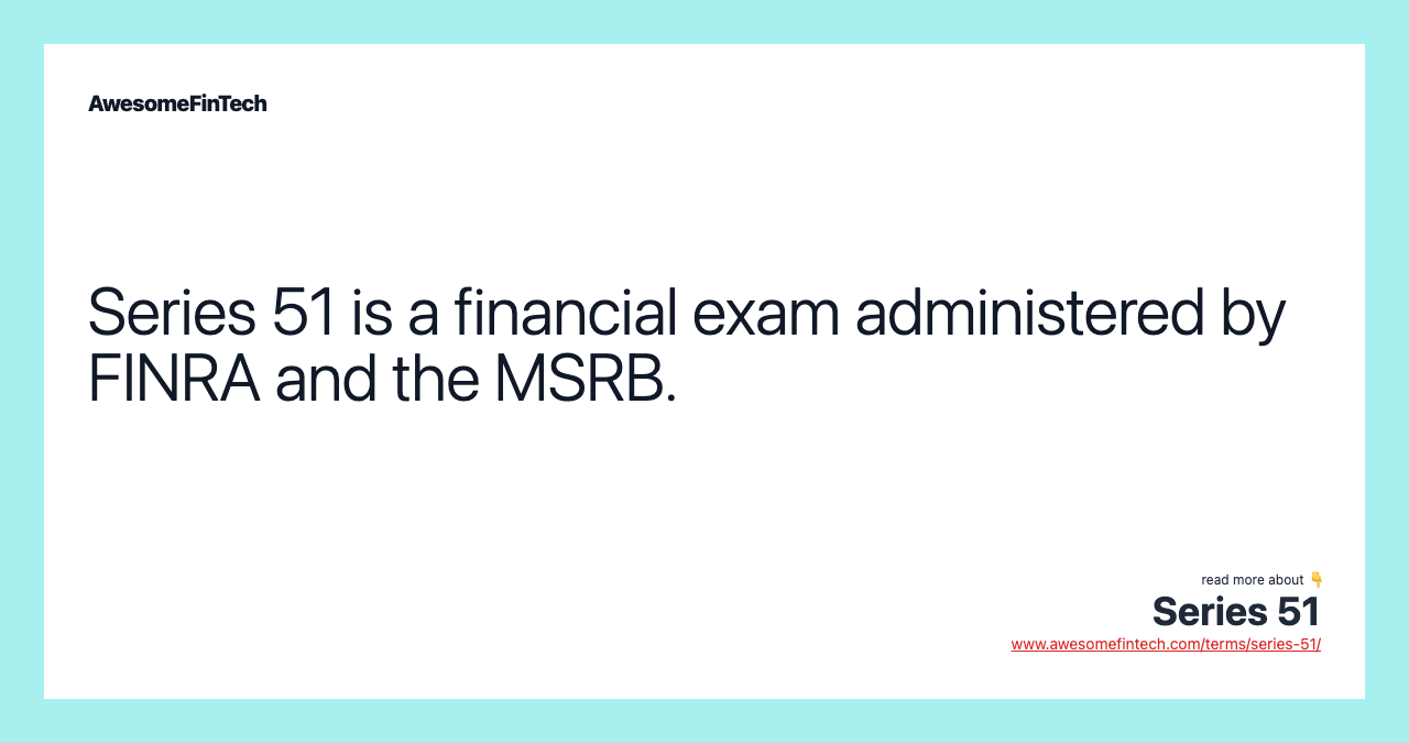 The Series 51 is a financial exam for professionals wishing to sell municipal fund securities or oversee the sale of such securities. The Series 51 is a financial exam for professionals wishing to sell municipal fund securities or oversee the sale of such securities. The purpose of the Series 51 exam is to determine whether the candidate meets the MSRB’s qualifications for professionals engaged in the sale or oversight of municipal fund securities. Once they have passed the Series 51 exam and met all additional requirements, candidates will be authorized to underwrite, trade, and sell municipal securities. To take the exam, candidates must have first passed the Series 24 or Series 26 exams.