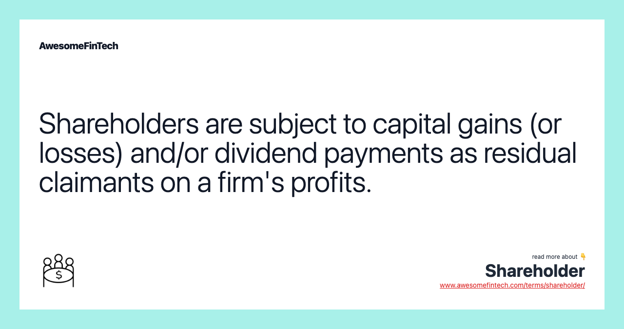 A shareholder also referred to as a stockholder, is a person, company, or institution that owns at least one share of a company's stock, known as equity. Because shareholders are essentially own the company, they reap the benefits of a business's success. These rewards come in the form of increased stock valuations or as financial profits distributed as dividends.