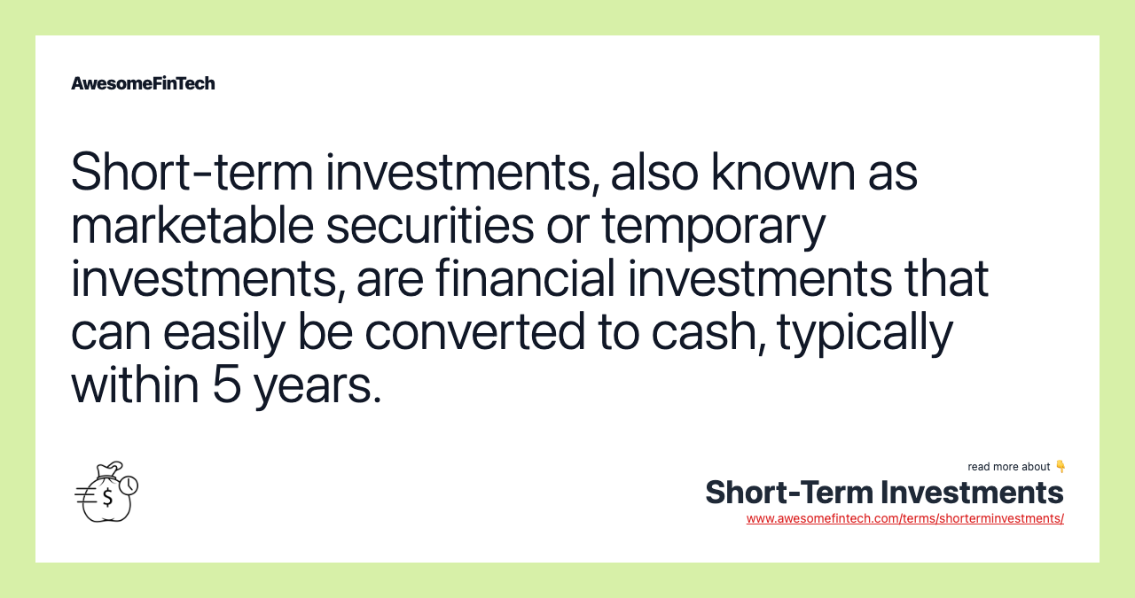 Short-term investments, also known as marketable securities or temporary investments, are financial investments that can easily be converted to cash, typically within 5 years. Many short-term investments are sold or converted to cash after a period of only 3-12 months. Some common examples of short-term investments include CDs, money market accounts, high-yield savings accounts, government bonds, and Treasury bills. Usually, these investments are high-quality and highly liquid assets or investment vehicles.
