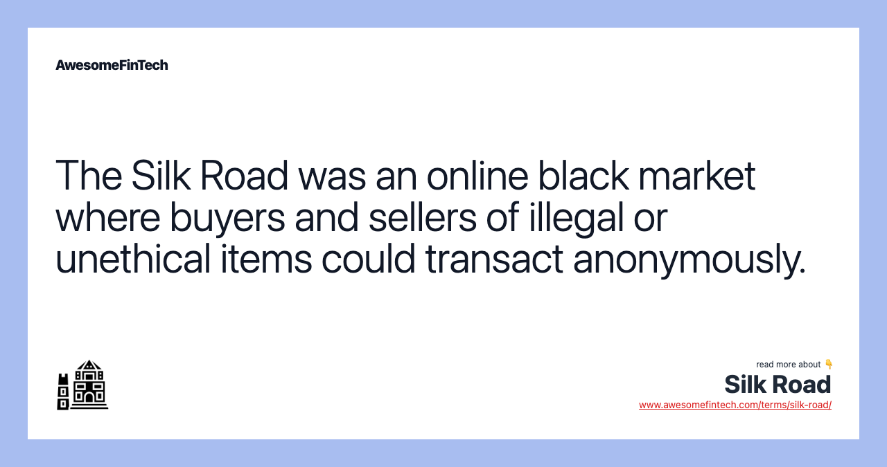 Silk Road was a digital black market platform that was popular for hosting money laundering activities and illegal drug transactions using Bitcoin. Silk Road, regarded as the first darknet market, was launched in 2011 and eventually shut down by the FBI in 2013. It was founded by Ross William Ulbricht, who is now serving a life sentence in prison for his role in Silk Road.