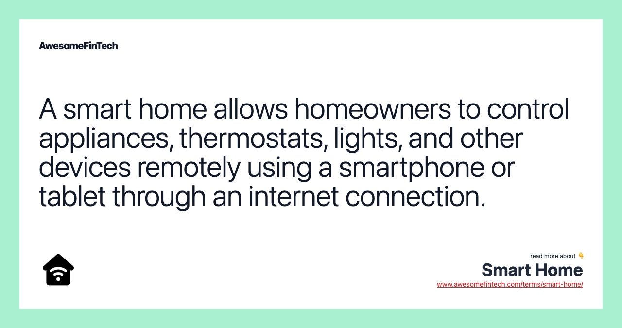 A smart home refers to a convenient home setup where appliances and devices can be automatically controlled remotely from anywhere with an internet connection using a mobile or other networked device. Devices in a smart home are interconnected through the internet, allowing the user to control functions such as security access to the home, temperature, lighting, and a home theater remotely.