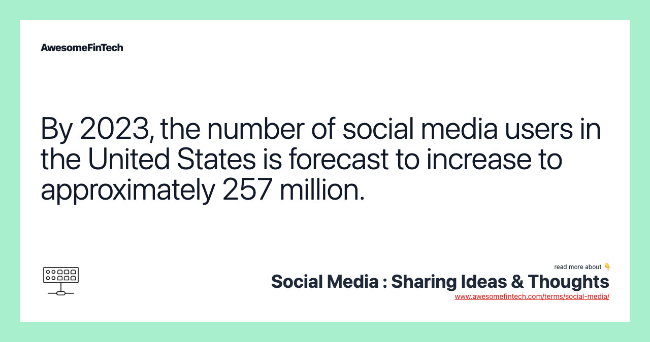 Globally, there are more than 3.8 billion social media users. Social media is an ever-changing and ever-evolving field, with new apps such as TikTok and Clubhouse coming out seemingly every year, joining the ranks of established social networks like Facebook, YouTube, Twitter, and Instagram. By 2023, the number of social media users in the United States is forecast to increase to approximately 257 million.