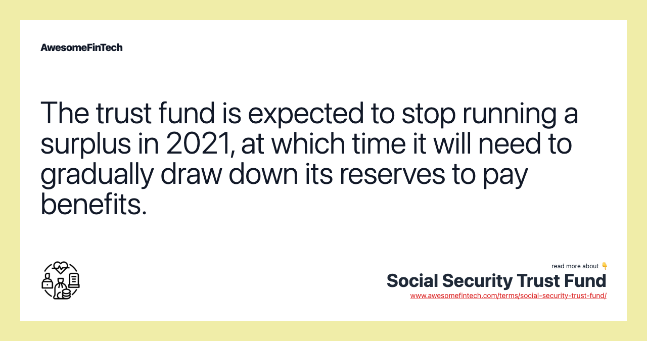 Following an increase in the Social Security payroll tax in the 1980s, the excess contributions from the tax increase were deposited into the Social Security Trust Fund to be used at a future date when the current assets of the Social Security system are no longer sufficient to cover their obligation. The asset reserves of the combined trust funds amounted to almost $2.9 trillion as of June 2021. For more information, the Social Security Administration (SSA) provides a FAQ guide covering the trust funds.
