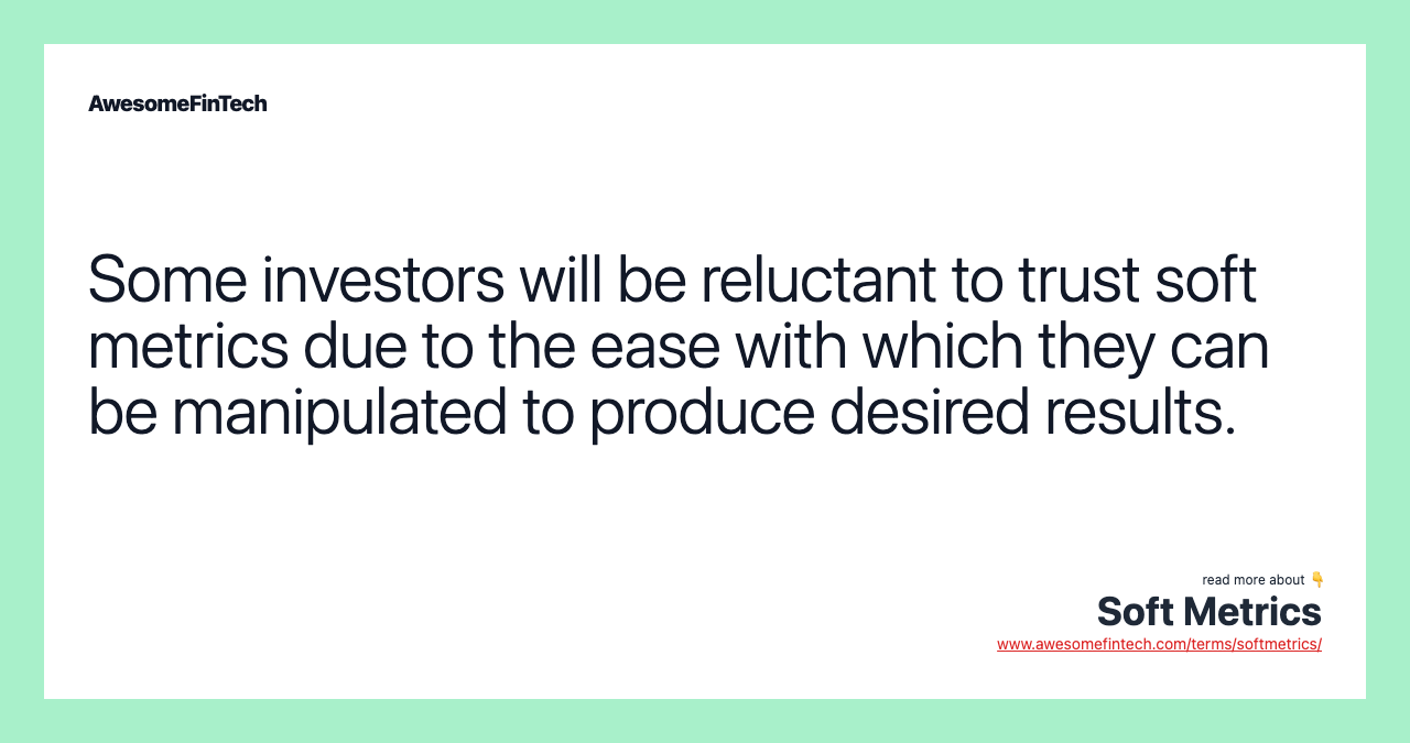In finance, the term “soft metrics” is used to describe indicators related to the value or performance of a company which deviate from traditional “hard” metrics such as net profit margins or earnings per share (EPS). Soft metrics are typically used when hard metrics are difficult to obtain. In finance, the term “soft metrics” is used to describe indicators related to the value or performance of a company which deviate from traditional “hard” metrics such as net profit margins or earnings per share (EPS). Soft metrics are typically used when hard metrics are difficult to obtain. They are typically designed at the discretion of the company or analyst in question, and can therefore prove difficult to independently verify. Some investors will be reluctant to trust soft metrics due to the ease with which they can be manipulated to produce desired results. Because they are intended to be flexible and tailored to the company at hand, there are a wide variety of potential soft metrics. Indeed, because soft metrics are not standardized and fall outside the strictures of Generally Accepted Accounting Practices (GAAP), analysts are free to develop new soft metrics as needed. When asked why they chose to exit their position, the VC firm responded that they were unconvinced by the progress being claimed by XYZ on the grounds that the company did not provide them with a detailed explanation for how their soft metrics were calculated.