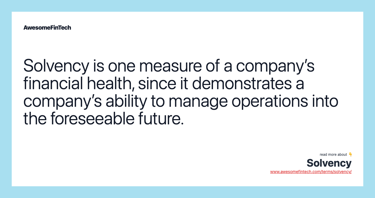 Solvency portrays the ability of a business (or individual) to pay off its financial obligations. For this reason, the quickest assessment of a company’s solvency is its assets minus liabilities, which equal its shareholders’ equity. There are also solvency ratios, which can spotlight certain areas of solvency for deeper analysis.