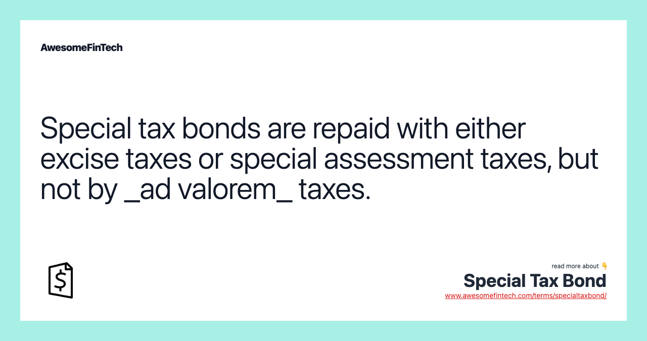 A special tax bond is a type of municipal bond that is typically repaid with revenue from a tax levied against an existing activity or asset specifically for that purpose. A type of special tax bond is the special assessment bond, which is a bond which has its payment obligations guaranteed from revenue received from the increment of taxes on residents who directly benefit from the project. A special tax bond is a type of municipal bond that is typically repaid with revenue from a tax levied against an existing activity or asset specifically for that purpose. A special tax bond is a type of municipal bond typically repaid with tax revenue levied against an existing activity or asset. A special tax bond is a hybrid security that combines features of a general obligation bond and a revenue bond.