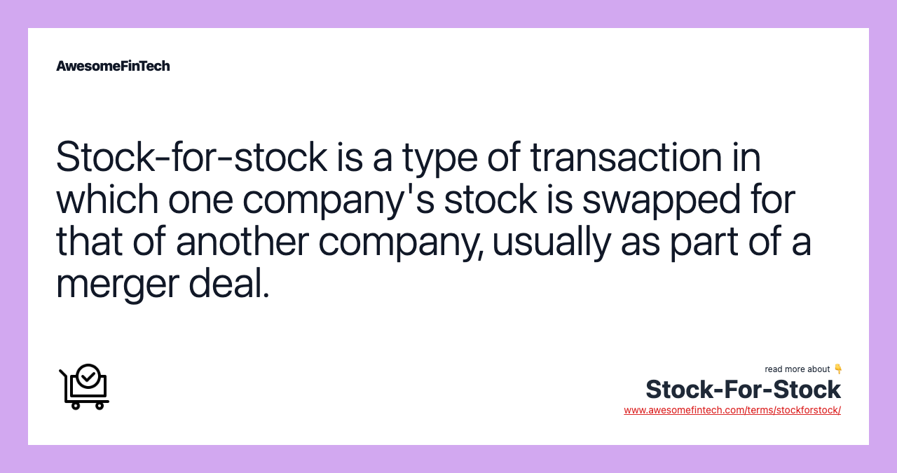 In the context of mergers and acquisitions, stock-for-stock refers to the exchange of an acquiring company's stock for the stock of the acquired company at a predetermined rate. Usually, only a portion of a merger is completed with a stock-for-stock transaction, with the rest of the expenses being covered with cash or other payment methods.