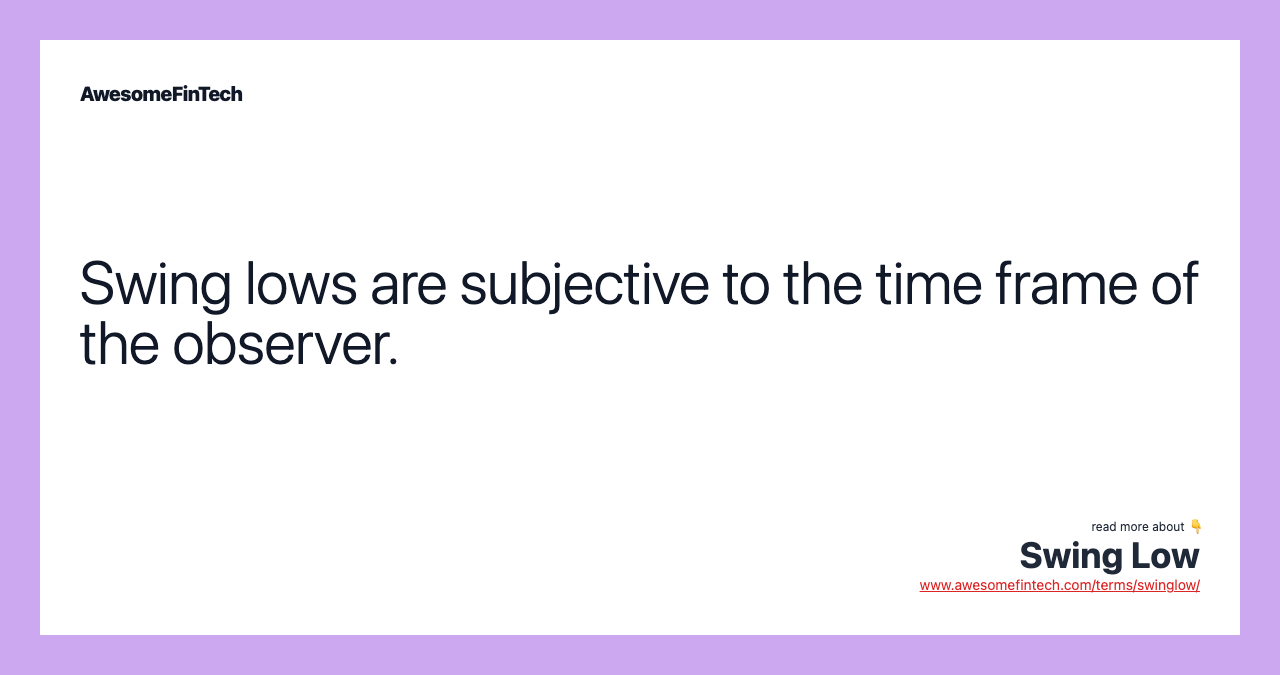 A swing low represents a relative low point in price action within a given time frame. On a daily chart, a swing low would likely be the lowest price in the most recent month. A swing low is often associated with swing trading strategies.