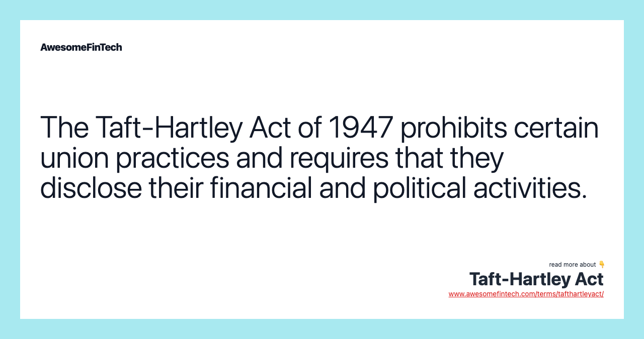 The Taft-Hartley Act is a 1947 U.S. federal law that extended and modified the 1935 Wagner Act. It prohibits certain union practices and requires disclosure of certain financial and political activities by unions. The bill was initially vetoed by President Truman, but Congress overrode the veto.