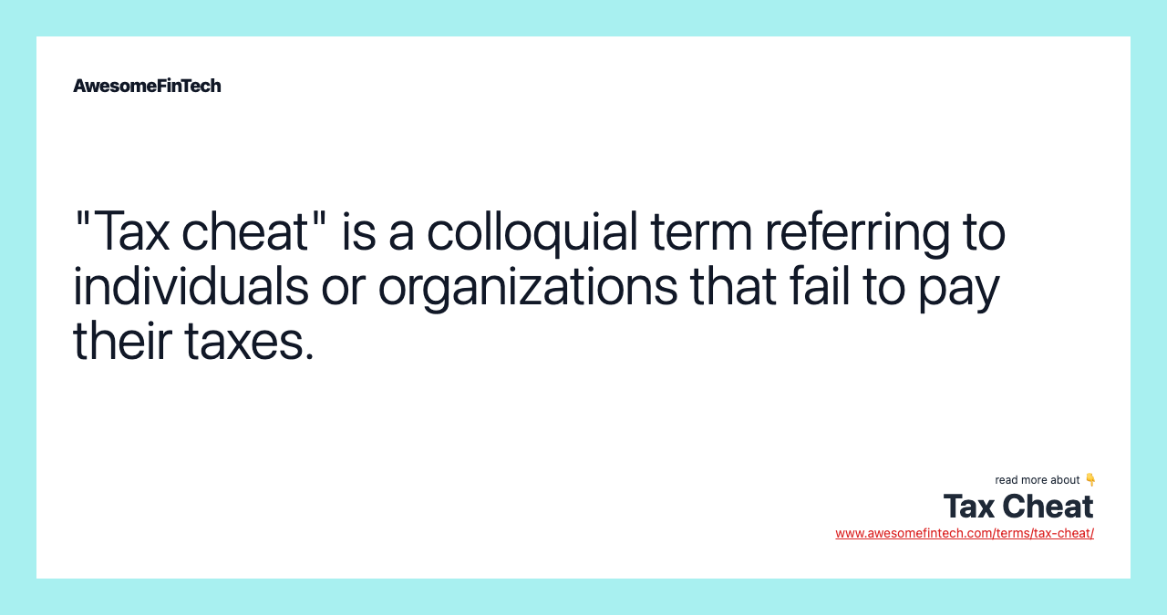The term "tax cheat" refers to an individual or group who fails to pay the tax required of them by law. Depending on the usage, the term may also refer to individuals who use aggressive tax avoidance strategies despite technically following the letter of the law.