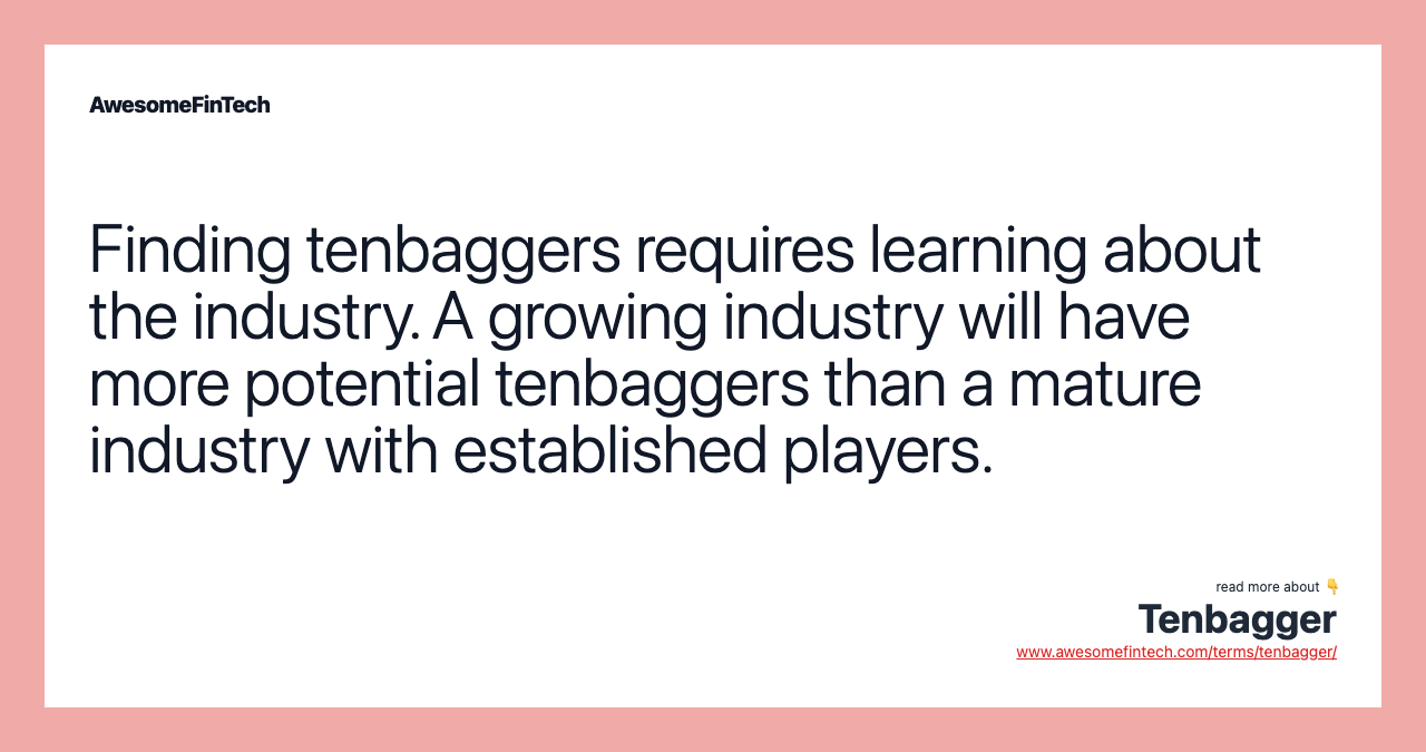 A tenbagger is an investment that appreciates in value 10 times its initial purchase price. The term “tenbagger” was coined by legendary fund manager Peter Lynch in his book One Up On Wall Street.