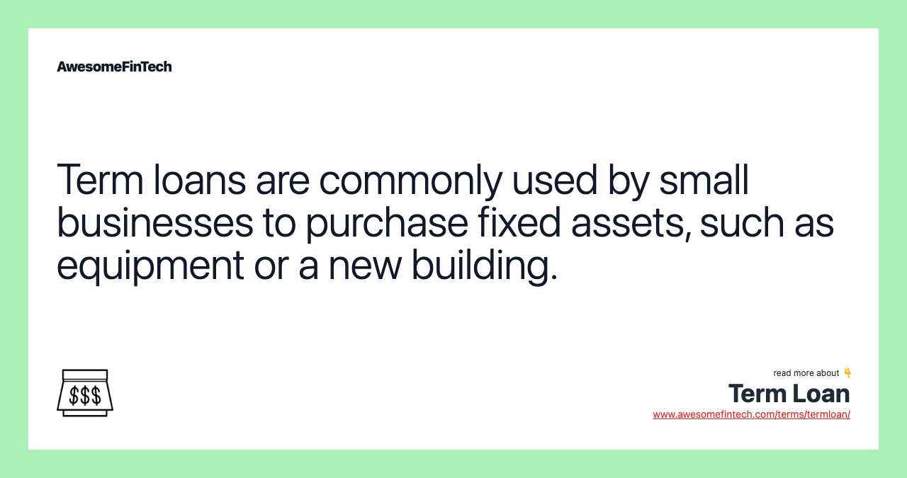 Term loans are commonly granted to small businesses that need cash to purchase equipment, a new building for their production processes, or any other fixed assets to keep their businesses going. Some businesses borrow the cash they need to operate on a month-to-month basis. Many banks have established term loan programs specifically to help companies in this way.