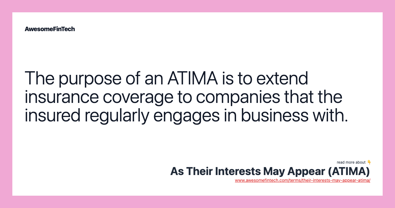 ATIMA extends an insurance policy's coverage to include companies that work with the insured company without requiring that they be named in the policy. For example, the insured company may use equipment rented from another company. This other party may be covered as an “additional insured.” The company and every item of equipment it rents to the insured does not have to be listed in the policy. It is covered by the term “as their interests may appear.”