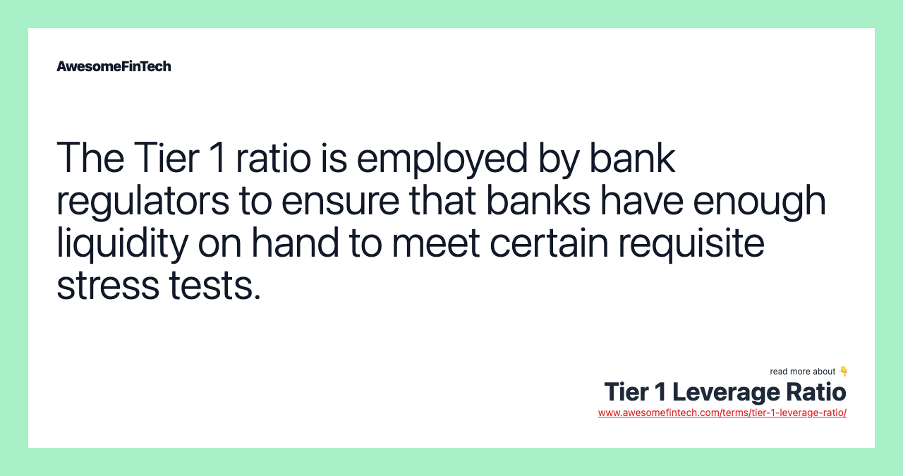 The Tier 1 leverage ratio is frequently used by regulators to ensure the capital adequacy of banks and to place constraints on the degree to which a financial company can leverage its capital base.