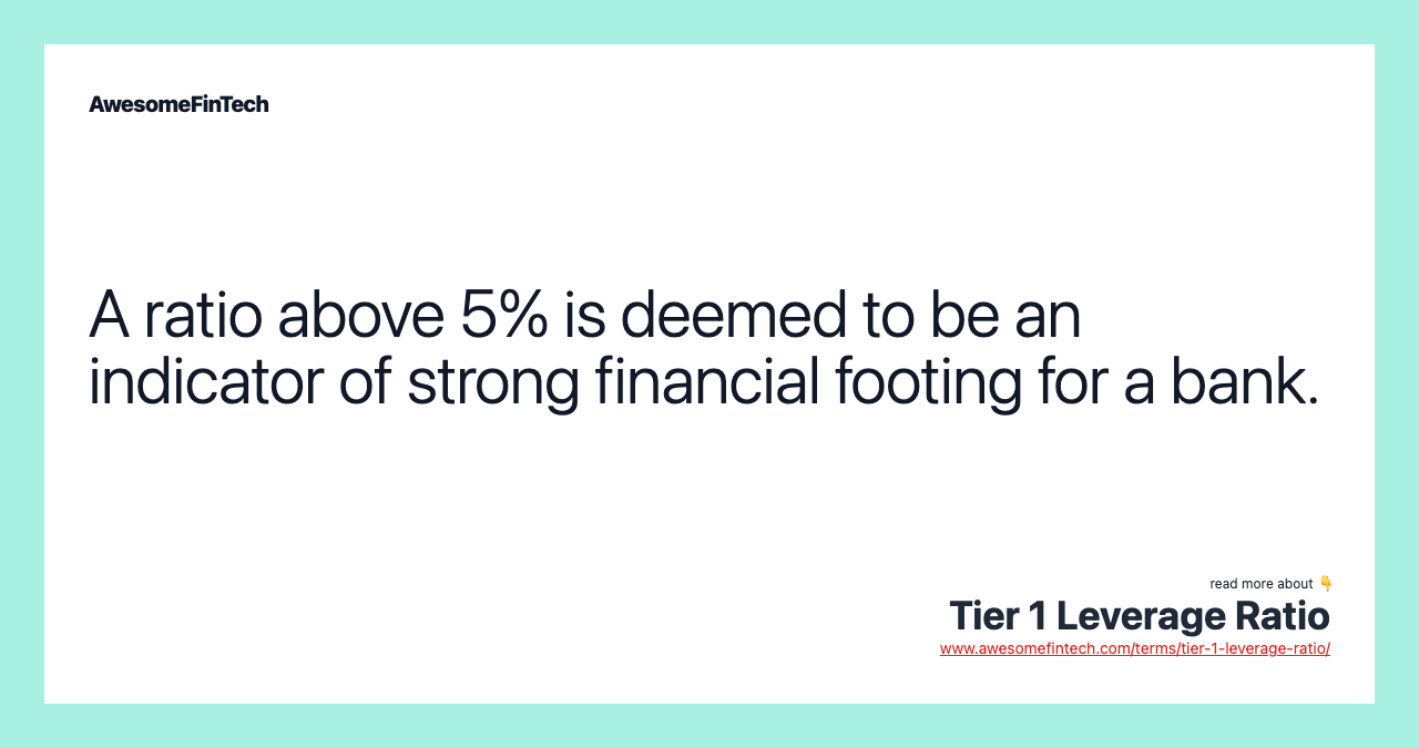 The Tier 1 leverage ratio measures a bank's core capital relative to its total assets. It is a key measure of a bank's financial strength that has been adopted as part of the Basel III Accord on bank regulation. The Tier 1 capital ratio measures a bank’s core equity capital against its total risk-weighted assets, which include all the assets the bank holds that are systematically weighted for credit risk. The ratio uses Tier 1 capital to judge how leveraged a bank is in relation to its consolidated assets, whereas the Tier 1 capital ratio measures the bank's core capital against its risk-weighted assets. The Tier 1 capital ratio is the ratio of a bank’s core Tier 1 capital — that is, its equity capital and disclosed reserves — to its total risk-weighted assets. We can calculate the ratio by taking the total Tier 1 capital of $186,189 billion (highlighted in green) and divide it by the bank's total assets of $2.240 trillion (highlighted in blue). The calculation is as follows: $ 186 , 189 billion $ 2.240 trillion × 100 \= 8.3 % \\frac{ \\$186,189 \\text{ billion} }{ \\$2.240 \\text{ trillion} } \\times 100 = 8.3\\% $2.240 trillion$186,189 billion×100\=8.3% Bank of America's Tier 1 leverage ratio of 8.3% was well above the requirement of 5% by regulators.  Image by Sabrina Jiang