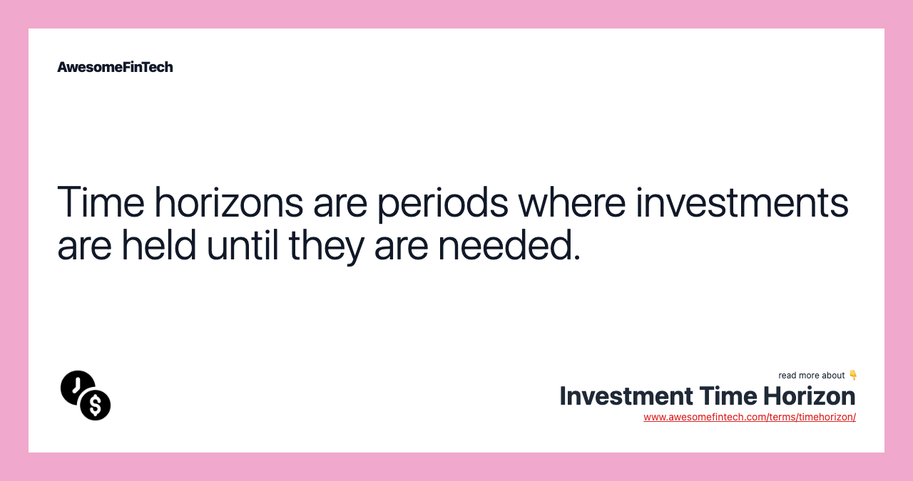 An investment time horizon, or just time horizon, is the period of time one expects to hold an investment until they need the money back. Time horizons are largely dictated by investment goals and strategies. For example, saving for a down payment on a house, for maybe two years, would be considered a short-term time horizon, while saving for college would be a medium-term time horizon, and investing for retirement, a long-term time horizon.