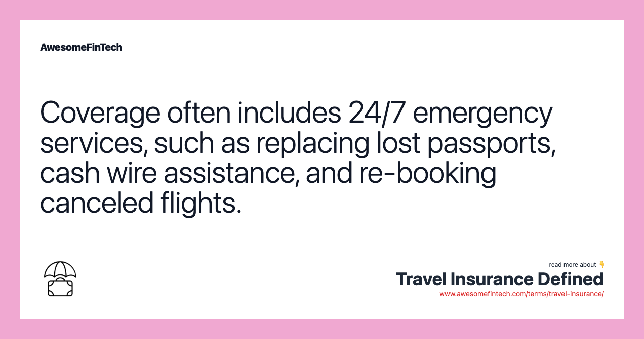Coverage often includes 24/7 emergency services, such as replacing lost passports, cash wire assistance, and re-booking canceled flights. Also, some travel insurance policies may duplicate existing coverage from other providers or offer protection for costs that are refundable by other means.