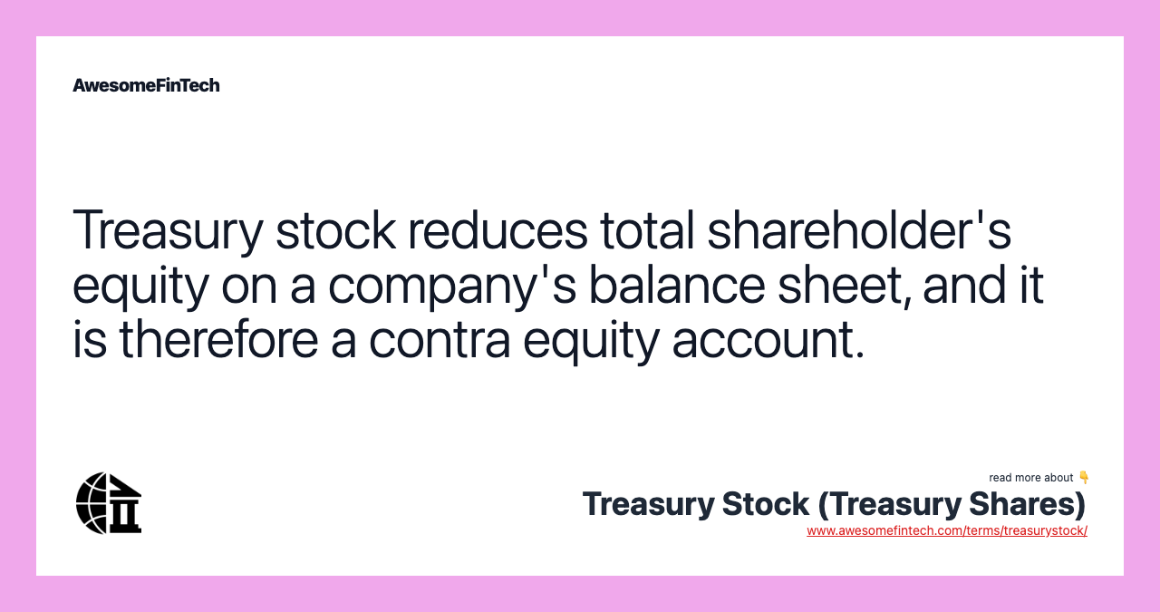 Treasury stock is a contra equity account recorded in the shareholder's equity section of the balance sheet. Because treasury stock represents the number of shares repurchased from the open market, it reduces shareholder's equity by the amount paid for the stock.