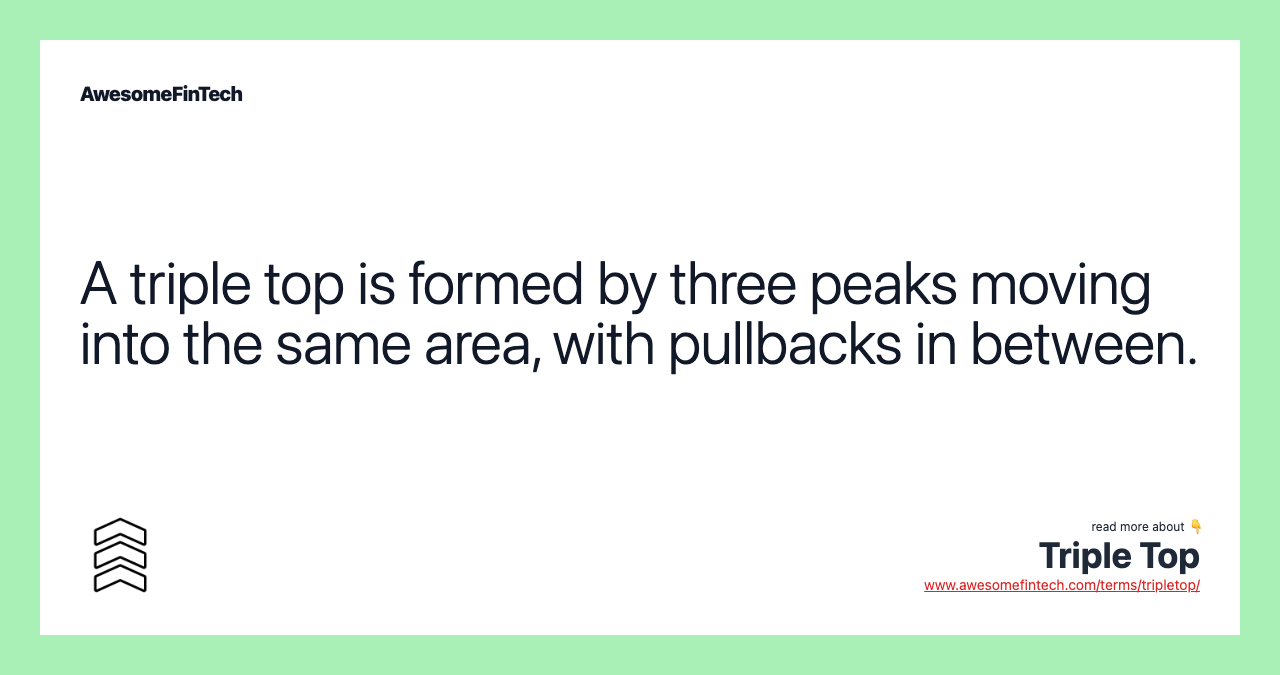 The triple top is a type of chart pattern used in technical analysis to predict the reversal in the movement of an asset's price. Consisting of three peaks, a triple top signals that the asset may no longer be rallying, and that lower prices may be on the way.