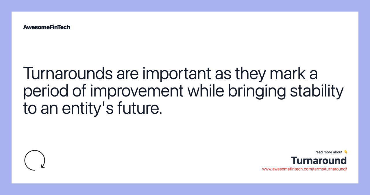 Turnarounds are important because they mark an upward shift or improvement for an entity after it experiences a significant period of negativity. The turnaround is akin to a restructuring process where the entity converts the period of loss into one of profitability and success while stabilizing its future. In investing, the term can mean the amount of elapsed time between the placing and fulfilling of an order.