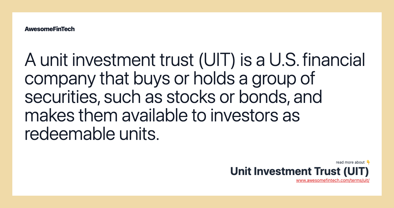 A unit investment trust (UIT) is an investment company that offers a fixed portfolio, generally of stocks and bonds, as redeemable units to investors for a specific period of time. Like open-ended mutual funds, UITs are bought and sold directly from the company that issues them, although sometimes they can be bought on the secondary market; like closed-end funds, UITs are issued via an initial public offering (IPO). Unlike mutual funds, UITs have a stated expiration date based on what investments are held in its portfolio; when the portfolio terminates, investors get their cut of the UIT's net assets. Also unlike mutual funds, UITs aren't actively-traded, meaning securities aren't bought or sold unless there's a change in the underlying investment, such as a corporate merger or bankruptcy. Investment companies offer individuals the opportunity to invest in a diversified portfolio of securities with a low initial investment requirement. A unit investment trust (UIT) is an investment company that offers a fixed portfolio, generally of stocks and bonds, as redeemable units to investors for a specific period of time. UITS are similar to both open-ended and closed-end mutual funds in that they all consist of collective investments in which many investors combine their funds to be managed by a portfolio manager.