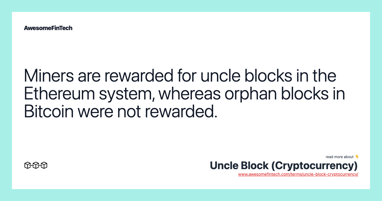 Uncle blocks are created on Ethereum\-based blockchains, and they are similar to Bitcoin's orphan block. In a process similar to the way Bitcoin creates orphan blocks, uncle blocks are created when more than one child block is created from a parent block. Due to this delay, a situation arises where another miner solves for the same block and tries to add it to the network chain, which results in a temporary and unsettled state of the blockchain network as the various nodes try to build a consensus about which of the newly identified blocks to continue with and which one to reject. Miners are rewarded for uncle blocks in the Ethereum system, whereas orphan blocks in Bitcoin were not rewarded. Moreover, since the release of Bitcoin Core v.0.10 in early 2015 that eliminated the ability for nodes to recognize blocks without ancestry, Bitcoin orphan blocks are no longer possible.