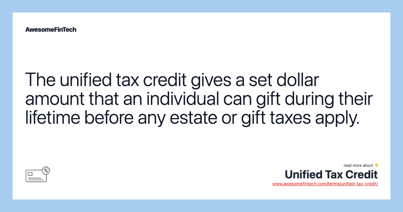 A unified tax credit is a certain amount of assets that each person is allowed to gift to other parties without having to pay gift, estate, or generation-skipping transfer taxes. The credit is afforded to every man, woman, and child in America by the Internal Revenue Service (IRS).