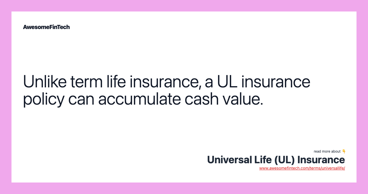 Table of Contents What Is Universal Life (UL) Insurance? How Universal Life (UL) Insurance Works Advantages and Disadvantages of Universal Life (UL) Insurance As cash value accumulates, policyholders may access a portion of the cash value without affecting the guaranteed death benefit. However, policyholders who do will pay taxes on the withdrawals they make from the excess cash value of the UL insurance plan. However, some require a single premium (single lump-sum premium) or fixed premiums (scheduled fixed premiums). Universal life (UL) insurance is a form of permanent life insurance with an investment savings element plus low premiums. Universal life (UL) insurance is permanent life insurance with an investment savings element and low premiums that are similar to those of term life insurance. Unlike whole life insurance policies, which have fixed premiums over the life of the policy, a UL insurance policy can have flexible premiums.