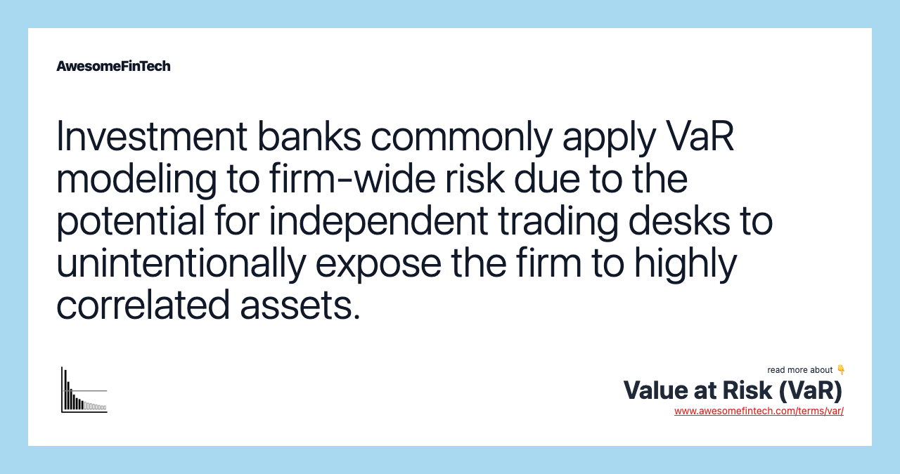 Value at risk (VaR) is a statistic that quantifies the extent of possible financial losses within a firm, portfolio, or position over a specific time frame. One can apply VaR calculations to specific positions or whole portfolios or use them to measure firm-wide risk exposure. Value at risk (VaR) is a way to quantify the risk of potential losses for a firm or an investment. Investment banks commonly apply VaR modeling to firm-wide risk due to the potential for independent trading desks to unintentionally expose the firm to highly correlated assets. The financial crisis of 2008 that exposed these problems as relatively benign VaR calculations understated the potential occurrence of risk events posed by portfolios of subprime mortgages. Value at risk (VaR) is a statistic that quantifies the extent of possible financial losses within a firm, portfolio, or position over a specific time frame.