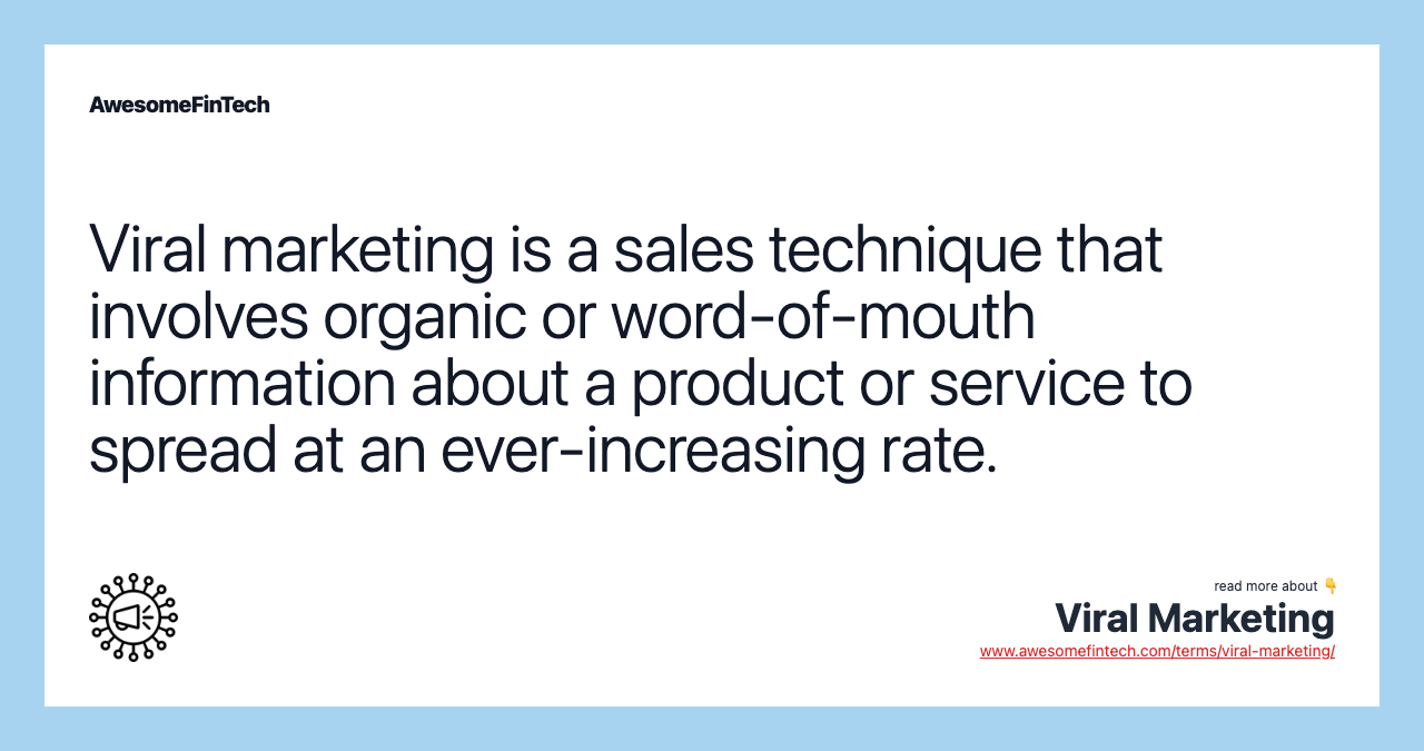 Viral marketing seeks to spread information about a product or service from person to person by word of mouth or sharing via the internet or email. The goal of viral marketing is to inspire individuals to share a marketing message to friends, family, and other individuals to create exponential growth in the number of its recipients.