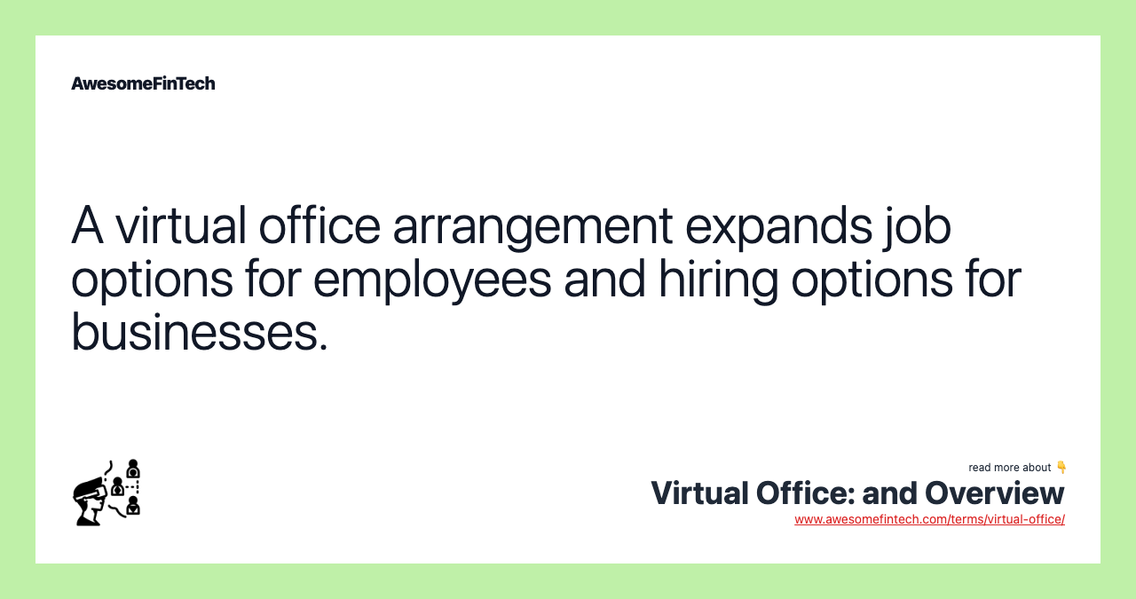 A virtual office gives businesses a physical address and office-related services without the overhead of a long lease and administrative staff. A virtual office gives businesses a physical address and office-related services without the overhead of a long lease and administrative staff. The costs of operating a virtual office are much less than a traditional office, and that's why this type of setup is popular among small businesses and startups. With a virtual office, employees can work from anywhere but still have things like a mailing address, phone answering services, meeting rooms, and videoconferencing. Some may find scheduling of virtual office space no different than the time-consuming scheduling conflicts inherent in a physical office.